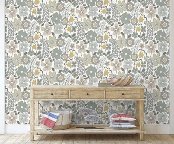 Flowers in bold lines and flat, off beat colors like olive, mustard and burnt orange have a child’s story book feel and similar cheery charm. Perfect for a bit of magic in a nursery or to add to the natural warmth and welcome of a kitchen.