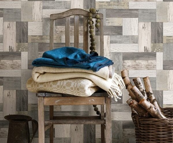 Distressed wood slats mimic a patchwork quilt pattern and create a warm and welcoming atmosphere. Goes well in a cheery kitchen or as an imaginative touch in a quieter space.